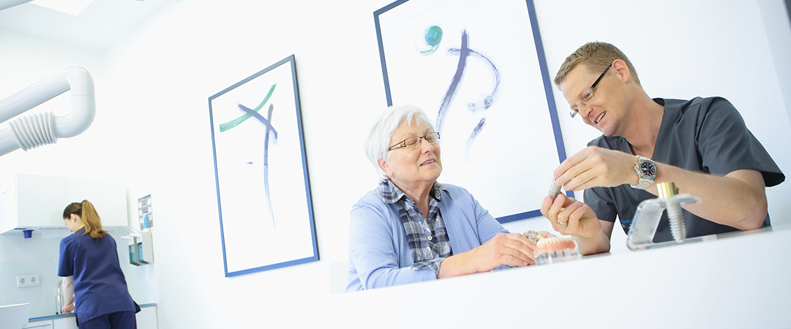 Zahnimplantate übernehmen die Funktion von Zahnwurzeln. Sie werden im Interesse eines sicheren Halts eingebracht und dienen nach der Ausheilung des Zahnfleisches als sichere Basis für Kronen oder Prothesen.